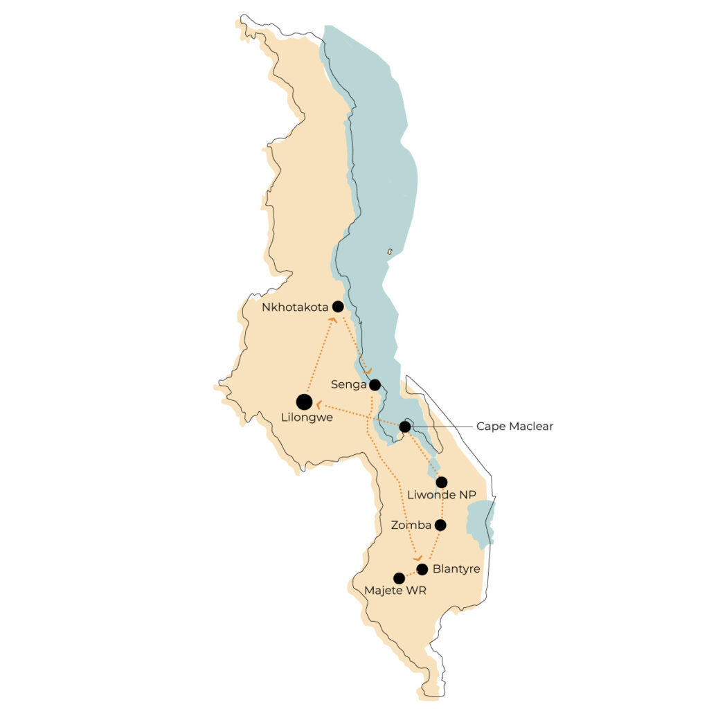 Je start dit avontuur in de hoofdstad van Malawi, Lilongwe. Van daaruit reis je naar Nkhotakota Wildlife Reserve, het oudste wild reservaat van Malawi. Na een eerste kennismaking met Lake Malawi, reis je verder naar het volgende wildpark, Majete Wildlife Reserve. Via het groene Zomba Plateau reis je naar het beroemde Liwonde National Park, waar je wordt verwend met een overvloed aan wilde dieren. Laatste stop is Cape Maclear waar je de reis ontspannen eindigt aan het strand van Lake Malawi.